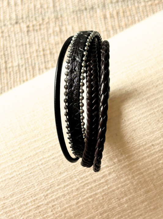 Sold outBlack Silver String Leather Bracelet